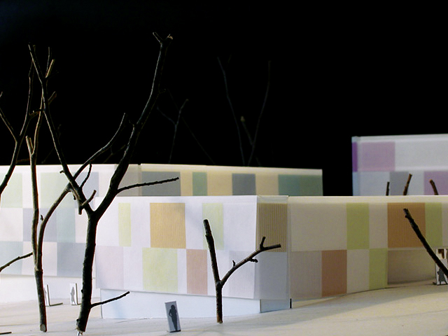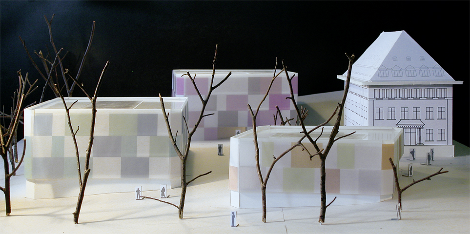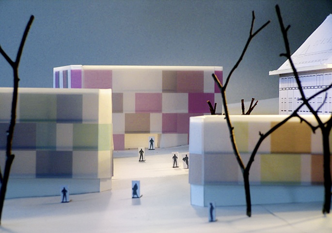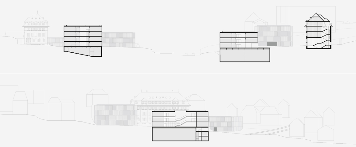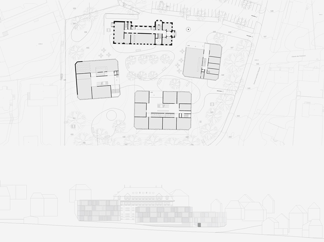 Les nouveaux bâtiments entourent et mettent en valeur le collège existant. Les quatre bâtiments forment un ensemble, comme quatre pierres d’un collier: agate, émeraude, améthyste, opale.