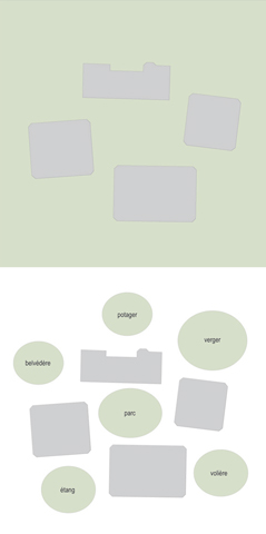 Les espaces de recréation différenciés s'intercalent entre les volumes construits. La fluidité du parc entre les bâtiments est soulignée. L’ambiance spécifique du lieu est mise en valeur par la plantation de vergers, pommiers, fruits des bois, potagers, ainsi que par la création des espaces de détente avec volière, étang, fontaine… |