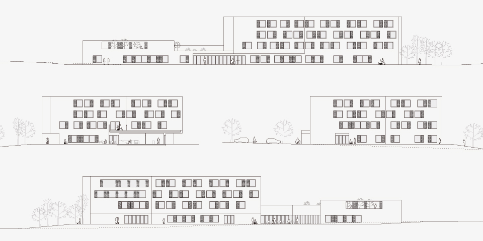 Les deux jardins thérapeutiques se situent sur la dalle du rez de plaint pied avec l'unité de psychogériatrie. Il s'agit d'une toiture végétalisée extensive ou intensive aménagée partiellement avec des collines de terre permettant la plantation d'espèces variées.